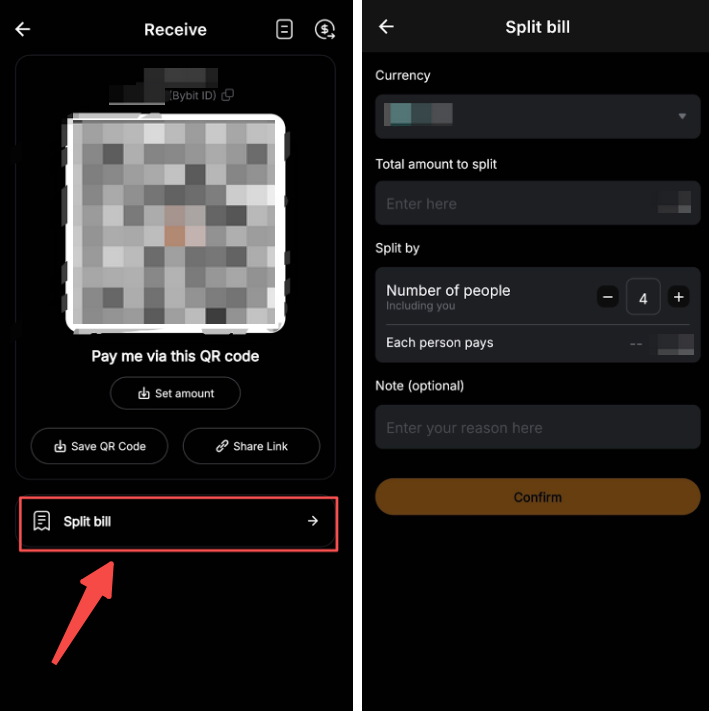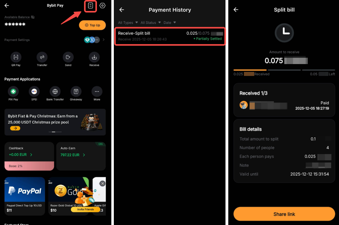 Split Bill is a Bybit Pay feature that enables two or more users to share a single bill with ease. You can create a payment request by entering the total amount and the number of payers. The system will automatically divide the bill evenly and generate a payment link or QR code that you can send through your preferred social channel. You can also track the payment status in real time. Please find below a step-by-step guide to create a split bill request.