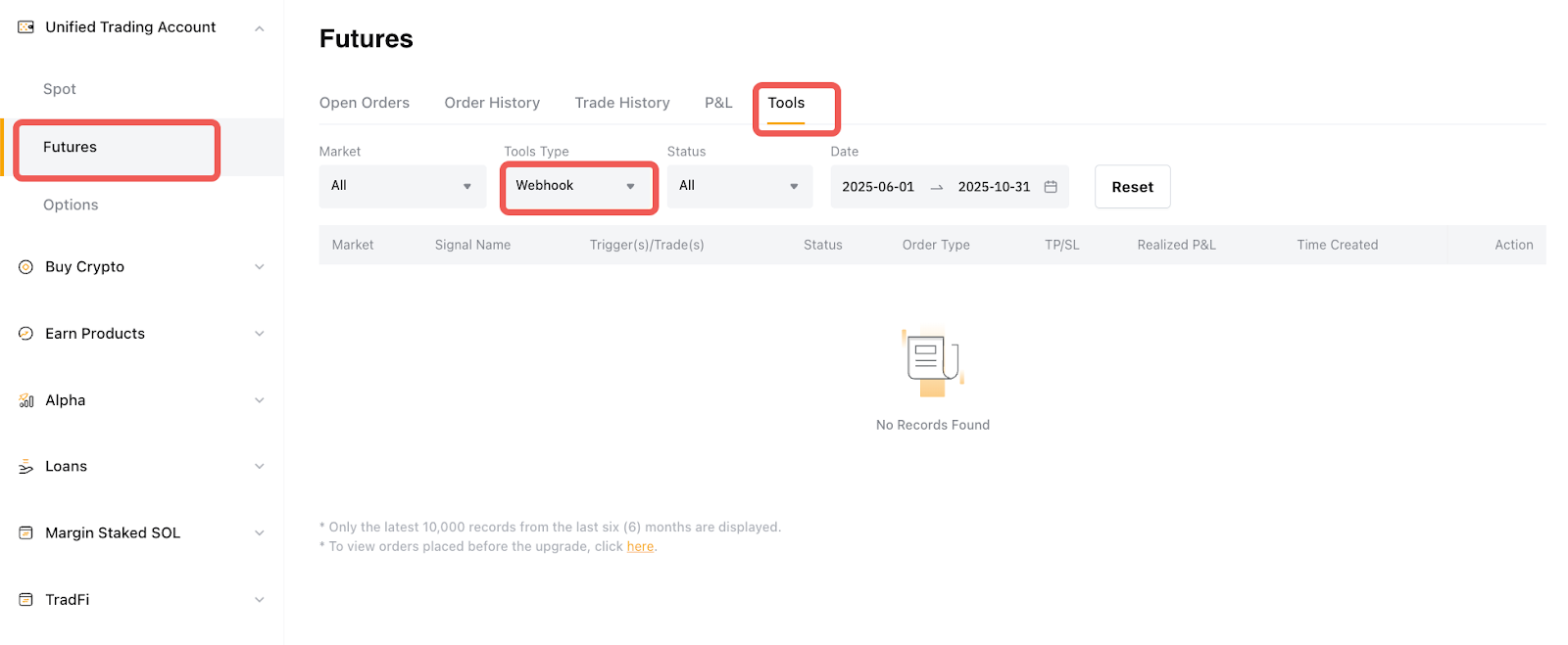 To view the specific details of the Webhook Signal, please go to the Tools tab, and then select Webhook. Here, you can view the Signal Name, Triggered / Trade Time, Realized P&L, and Time Created.