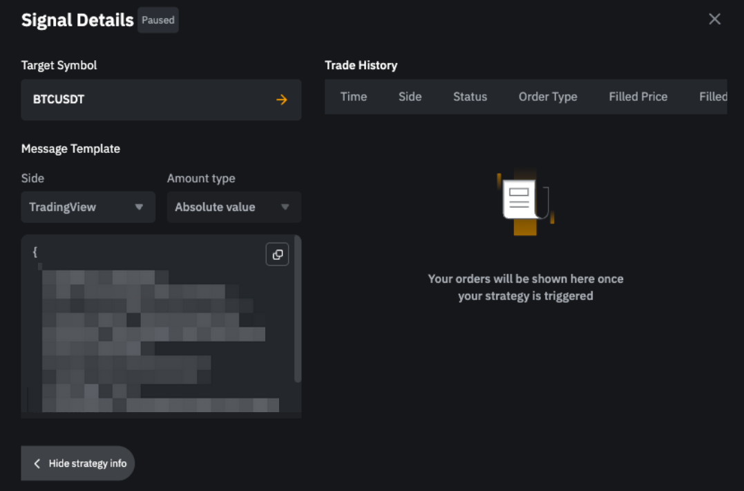 To view more of your Signal Details, click on the Details button beside and you can review your Webhook URL and Message Template. Also, you will be able to see the executed trade via this strategy.