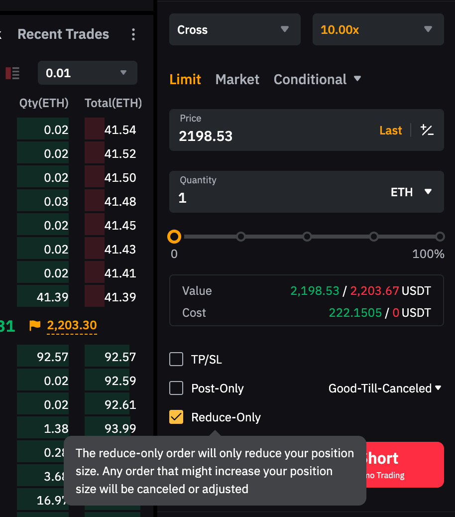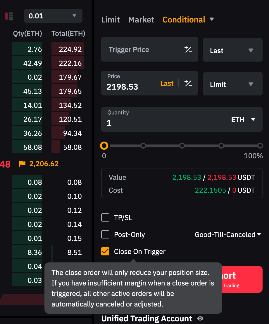 Note: If the order quantity exceeds your current position size, a new position in the opposite direction may be opened. To avoid this, you can enable Reduce Only for a limit order or Close on Trigger for a conditional order.