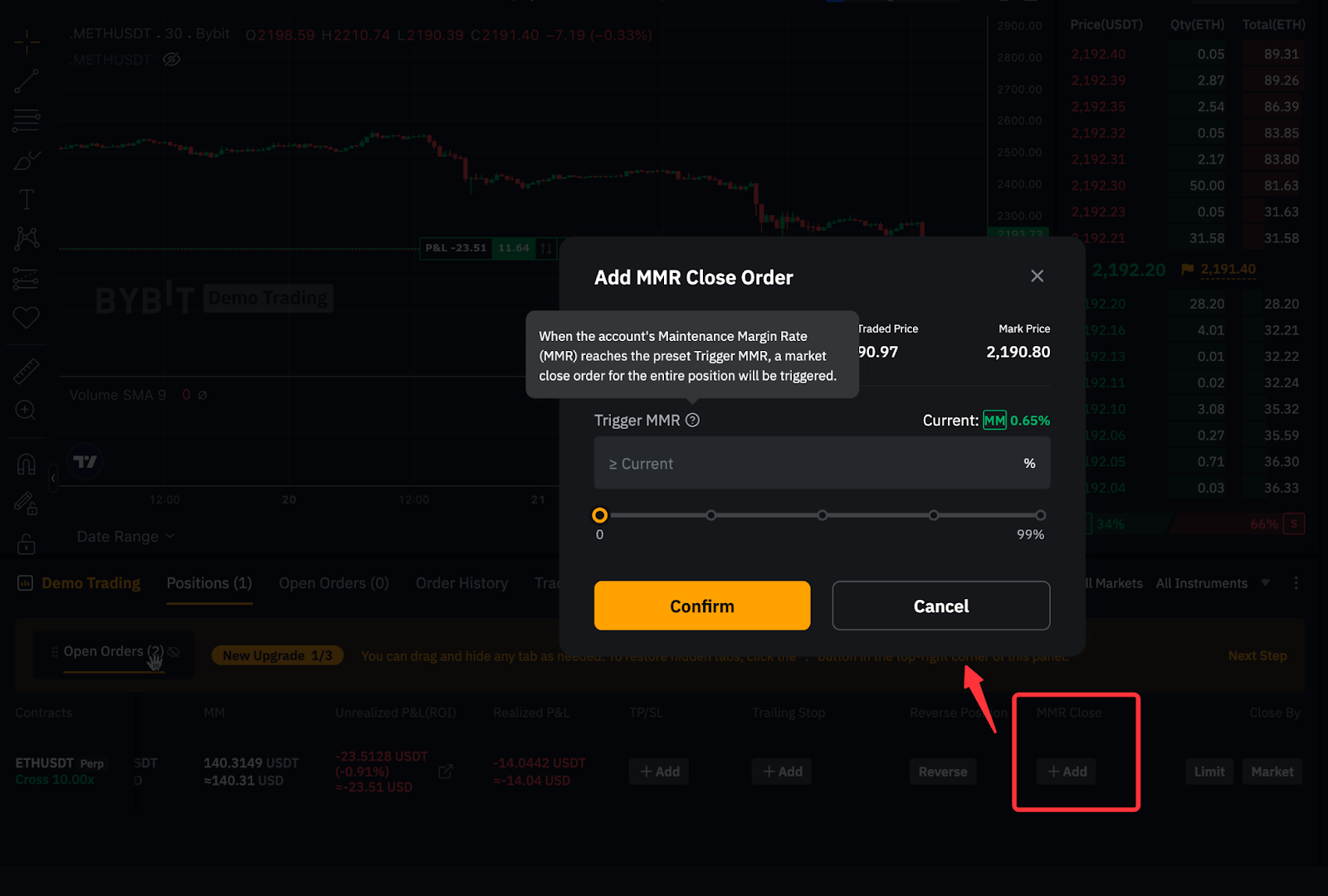 MMR Close will automatically place a market order to close the selected position in full if your account's maintenance margin rate (MMR) reaches the preset trigger level. For more information, visit Maintenance Margin Rate (MMR) Close Order.