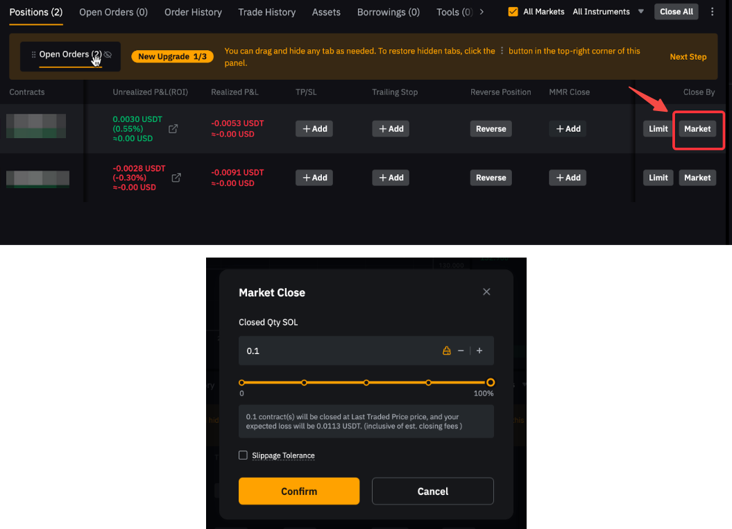 In the Positions tab, select Market under Close By. Enter the quantity you wish to close — partial position closures are supported. The Slippage Tolerance setting allows you to input the maximum price difference you're willing to accept for your market order, based on the Ask1 price for buys and the Bid1 price for sells.