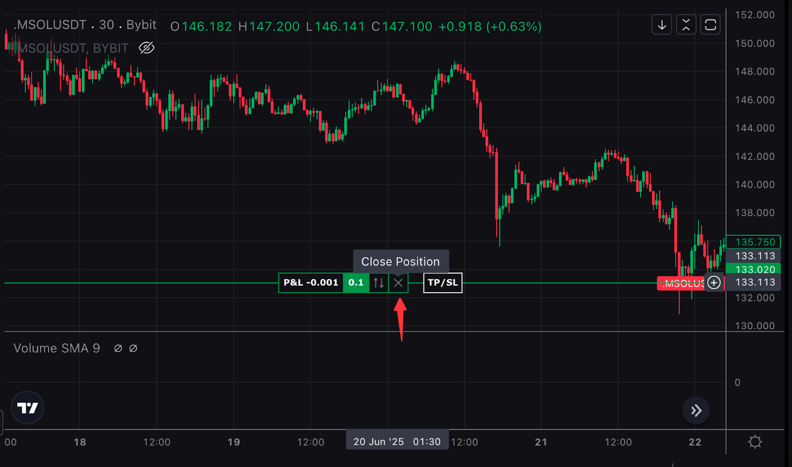 Click the Quick Close button on the chart to exit your entire position at the market price with one click.