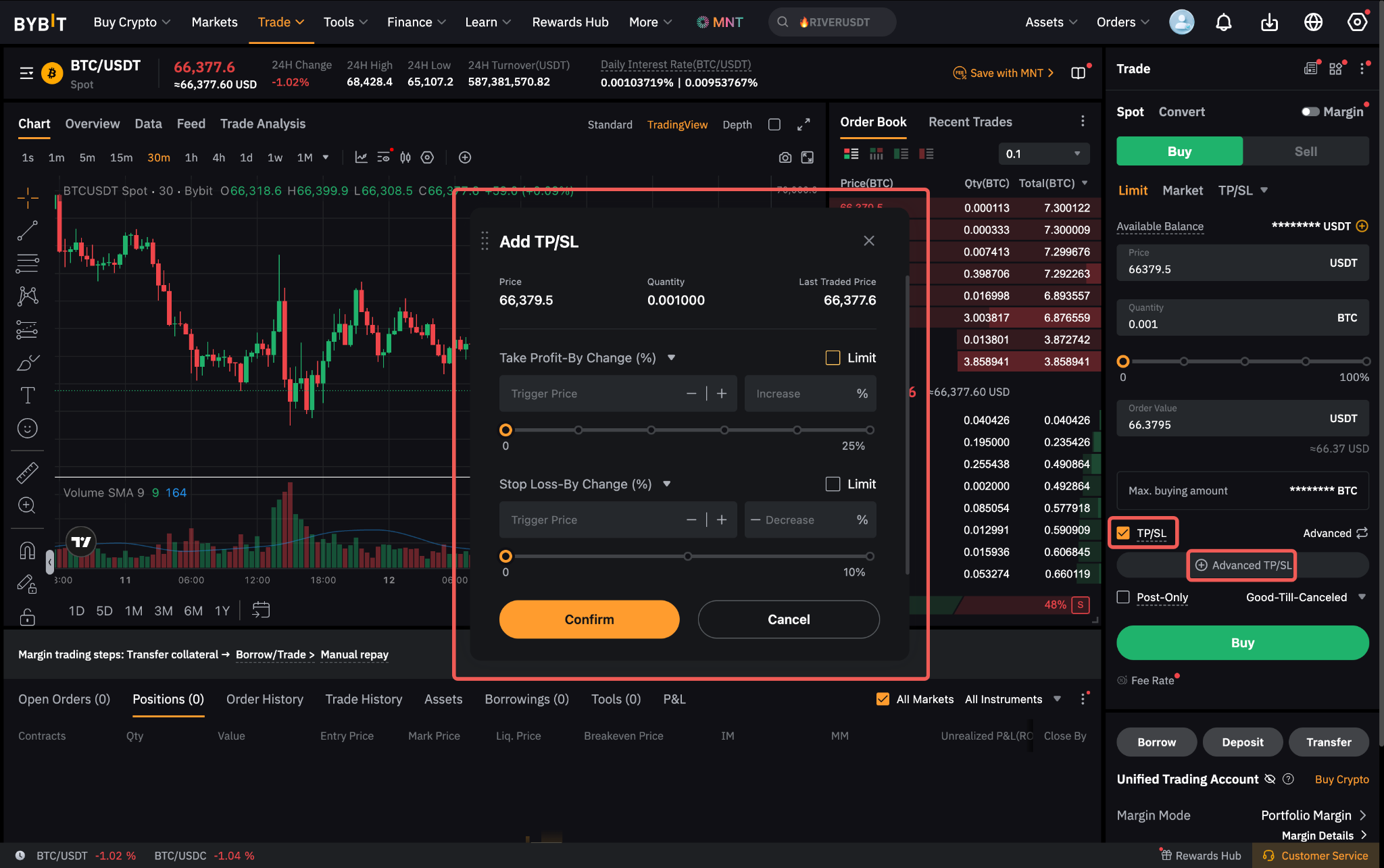 — For the TP/SL sell order attached to your Spot Limit buy order, the TP trigger price has to be higher than your Limit order price, while the SL trigger price has to be lower than your Limit order price.
