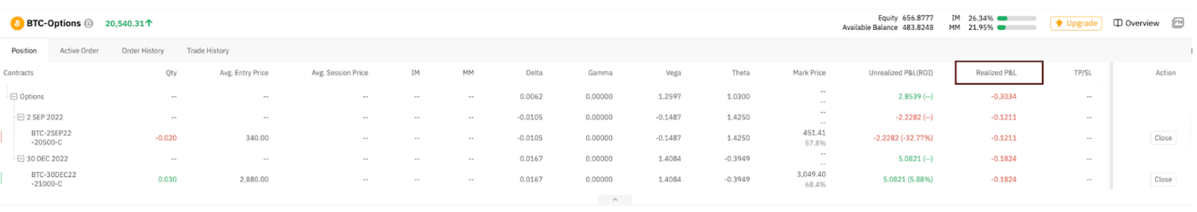 Bob sells a 0.3 of BTC BTCUSDT-31DEC21-50000-C with an average entry price of $2,600. The price of BTC rises, and when the mark price reaches $2,800, the unrealized P&L of the option he holds is [(2,600 − 2,800) × 0.3] = −60 USDT. |
