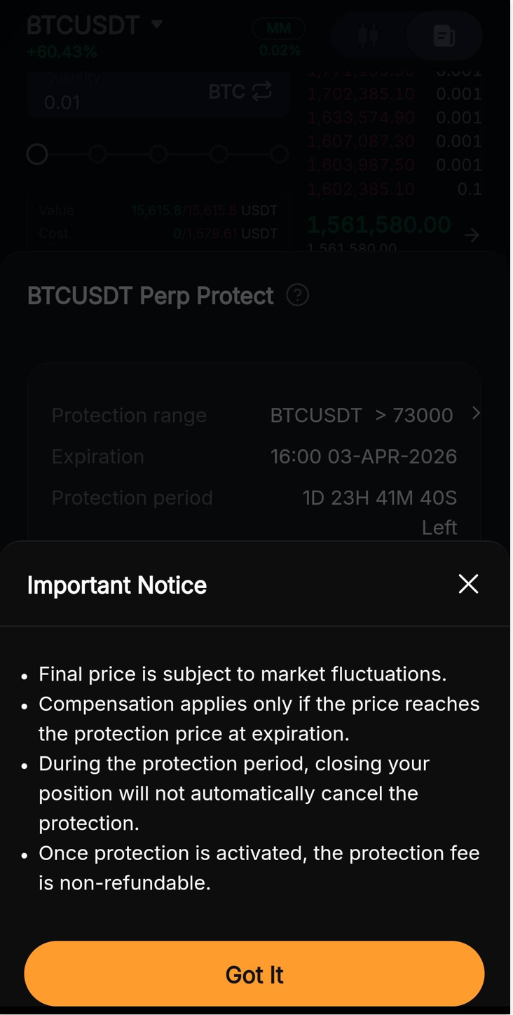 - Perp Protect is not a risk-free product. The liquidation process for your Perpetual positions will still follow standard procedures. Please ensure that you fully understand the product before purchasing.