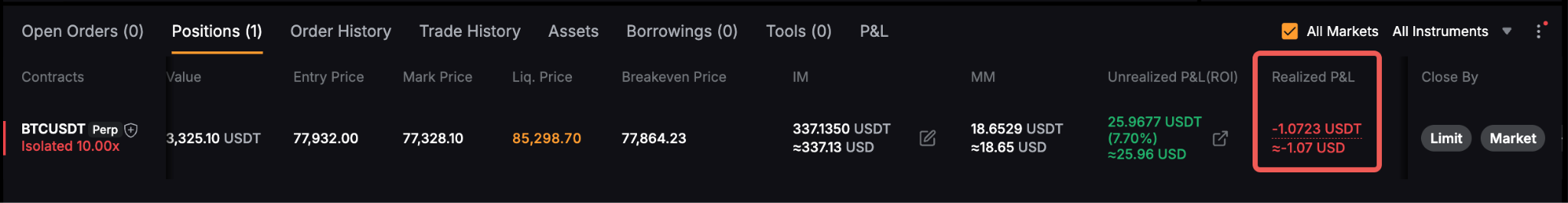 Realized P&L can be found on the position tab and it shows the sum of realized P&L of the position over the period. This includes all the trading fees, funding fees, and any position P&L realized from partial closing (same formula as unrealized P&L).