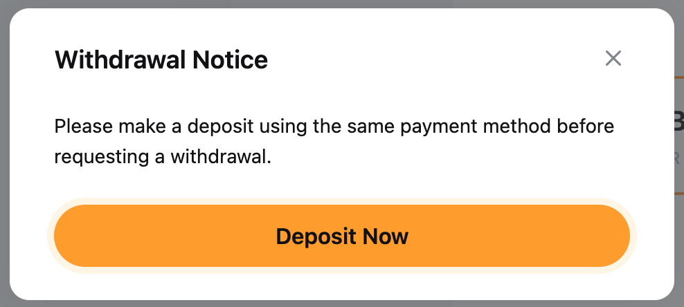 — Para ciertas divisas y métodos de pago, solo puede retirar fondos a una cuenta que ya haya utilizado para depositar utilizando el mismo método y la misma divisa. Si es una cuenta nueva, realice primero un depósito con éxito antes de intentar una retirada. Asegúrese de comprobar los requisitos de cada método de pago antes de realizar una retirada de fiat.