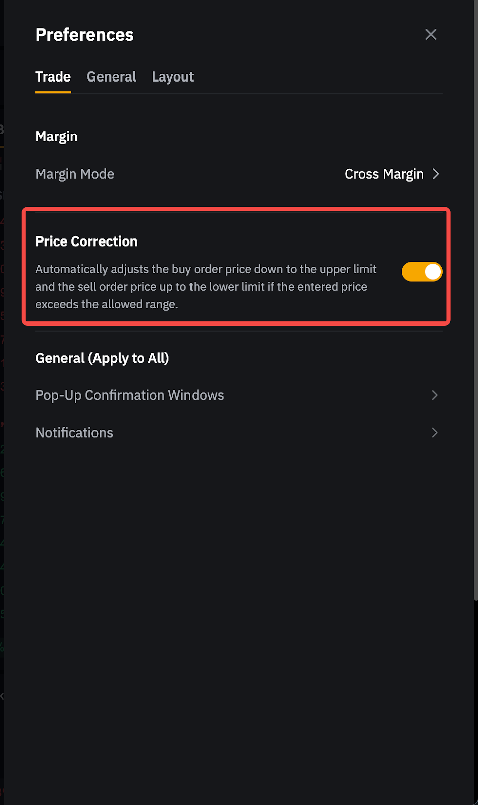 Untuk Pesanan Terbatas: Jika harga pesanan dari pesanan beli (atau jual) lebih tinggi (atau lebih rendah) dari batas harga, maka pesanan akan dibatalkan dan tidak akan dilaksanakan. Hal ini berlaku jika Anda telah menonaktifkan pengaturan Koreksi Harga (secara default). Jika Anda telah mengaktifkan pengaturan Koreksi Harga, harga pesanan dari pesanan beli (atau jual) akan secara otomatis disesuaikan ke bawah (atau ke atas) dari batas atas (atau batas bawah) ketika harga yang dimasukkan melebihi rentang yang diizinkan.