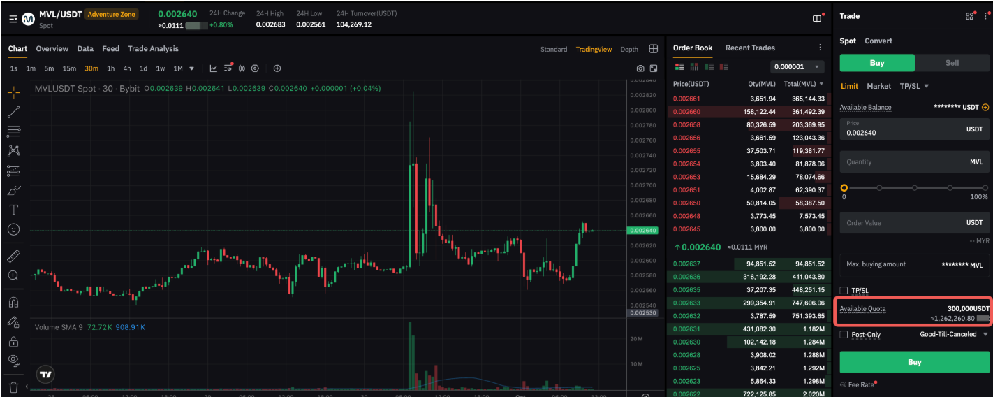Sebagai ilustrasi, kuota pesanan MVL adalah 300.000 USDT, dan harga pasar adalah 0,002640. Jumlah maksimum yang dapat dibeli pengguna dari pasar Spot adalah 113.636.363 MVL (300.000/0,002640). Setelah kuota ini tercapai, hanya pesanan jual yang diizinkan. Kenaikan nilai apa pun karena deposit atau perubahan harga setelah mencapai kuota tidak akan dibatasi. Anda dapat melihat kuota pesanan di jendela pesanan perdagangan spot.