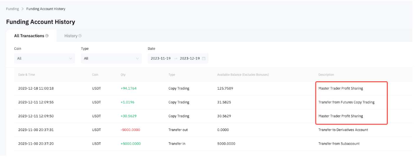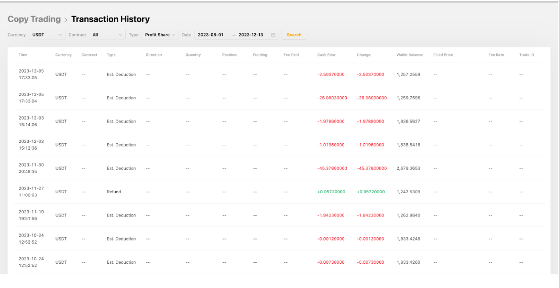 Anda dapat melihat riwayat potongan dan pengembalian dana dari halaman Riwayat Transaksi Copy Trading.