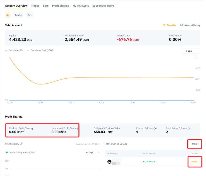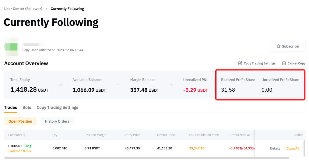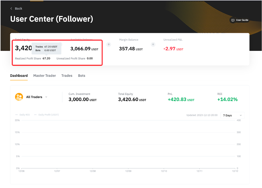 Silakan kunjungi Pusat Pengguna (Pengikut) dan Anda akan dapat melihat Bagi Hasil Terealisasi dan Belum Terealisasi untuk perdagangan dan bot perdagangan USDT Perpetual.