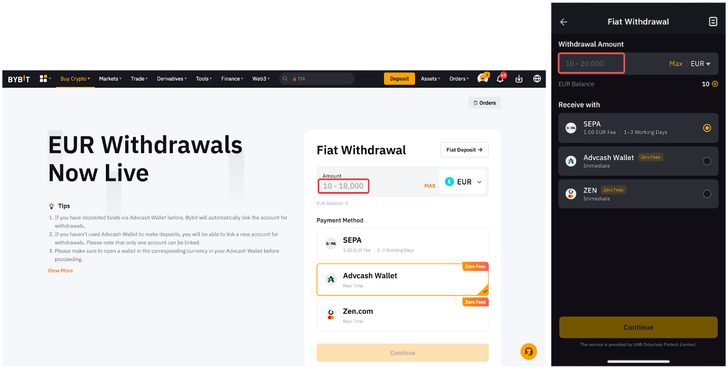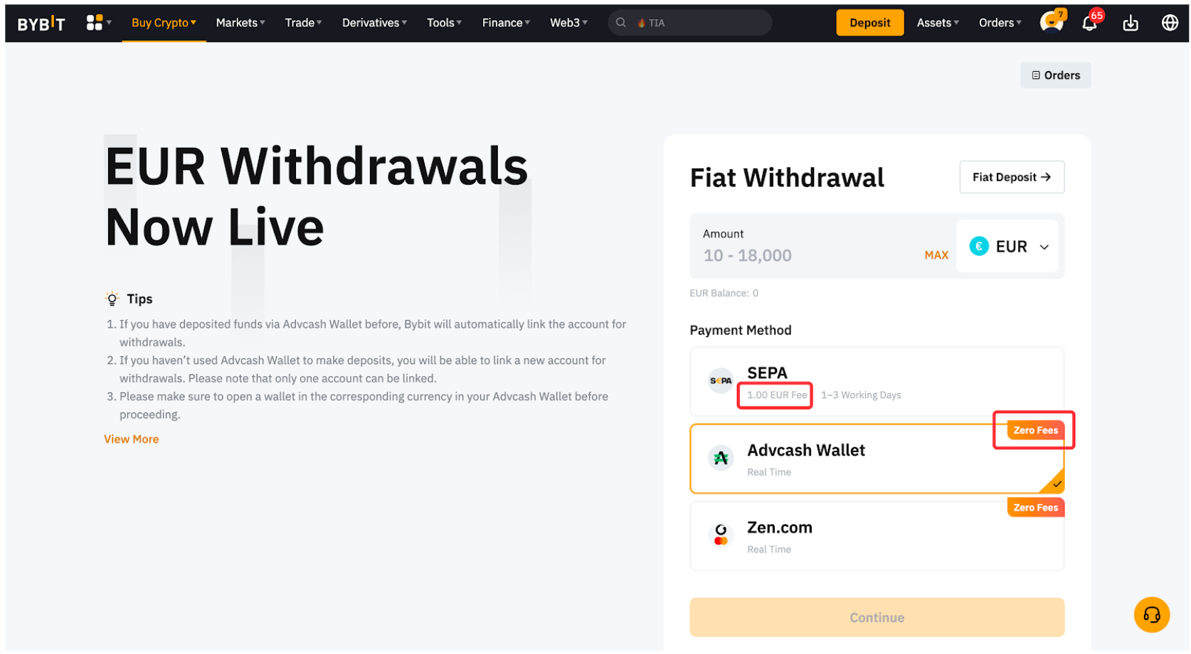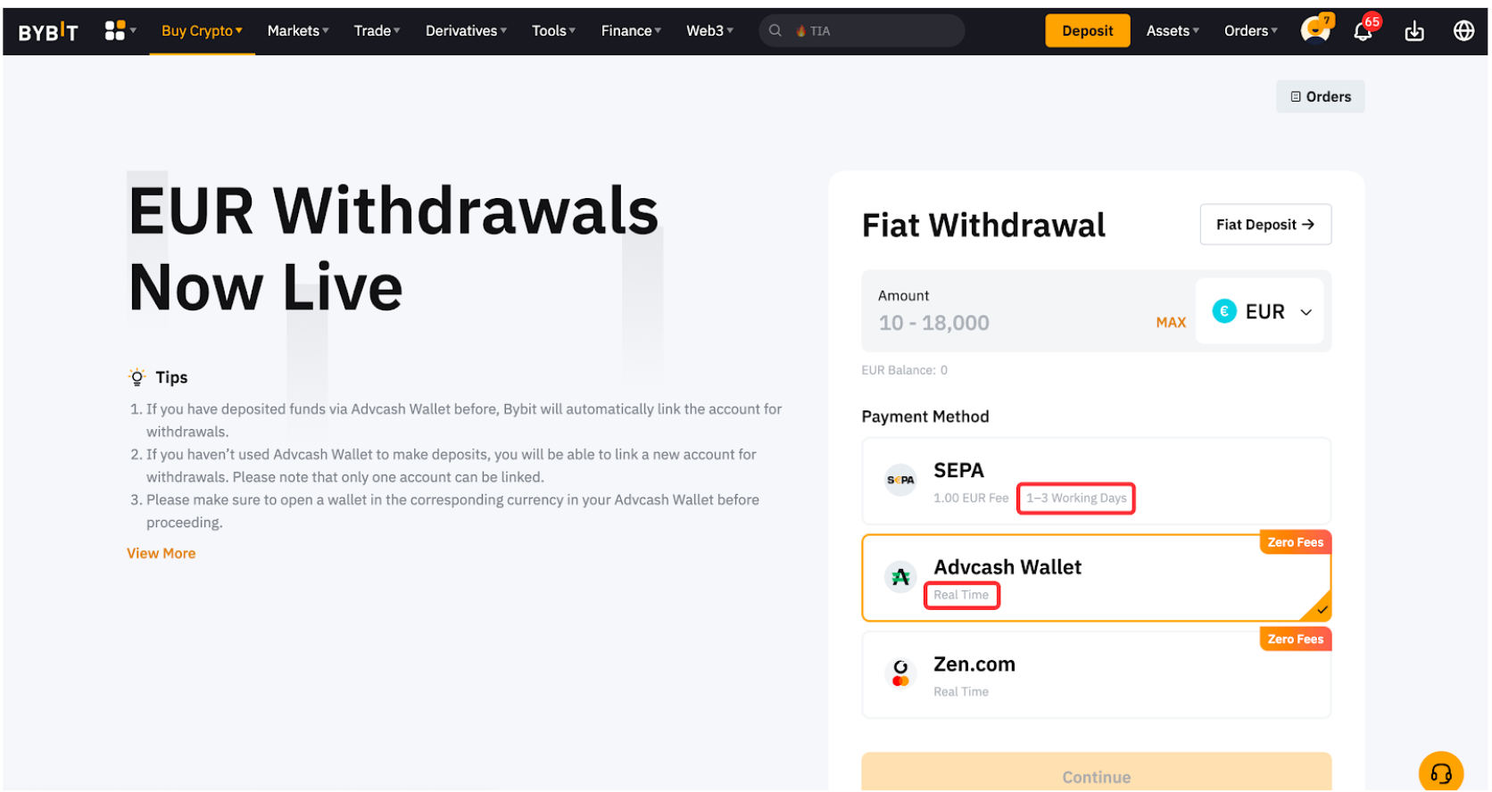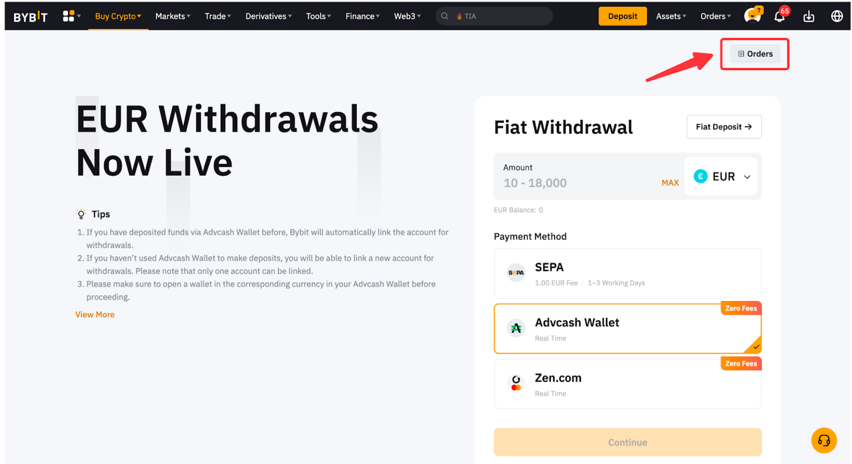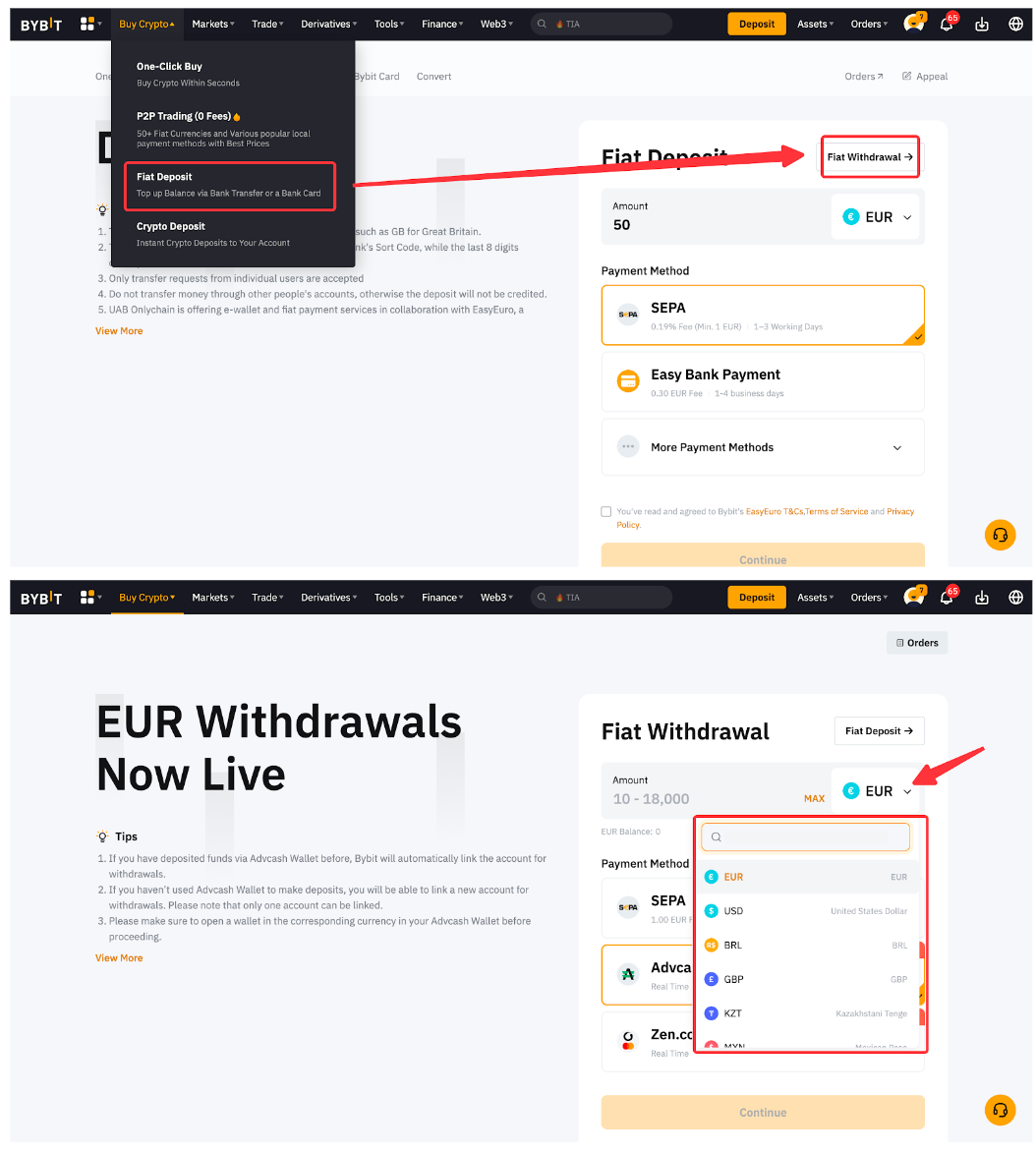 Hanya sejumlah mata uang fiat yang dapat ditarik di Bybit. Anda akan dapat melihat mata uang fiat yang didukung untuk penarikan fiat di laman Penarikan Fiat.