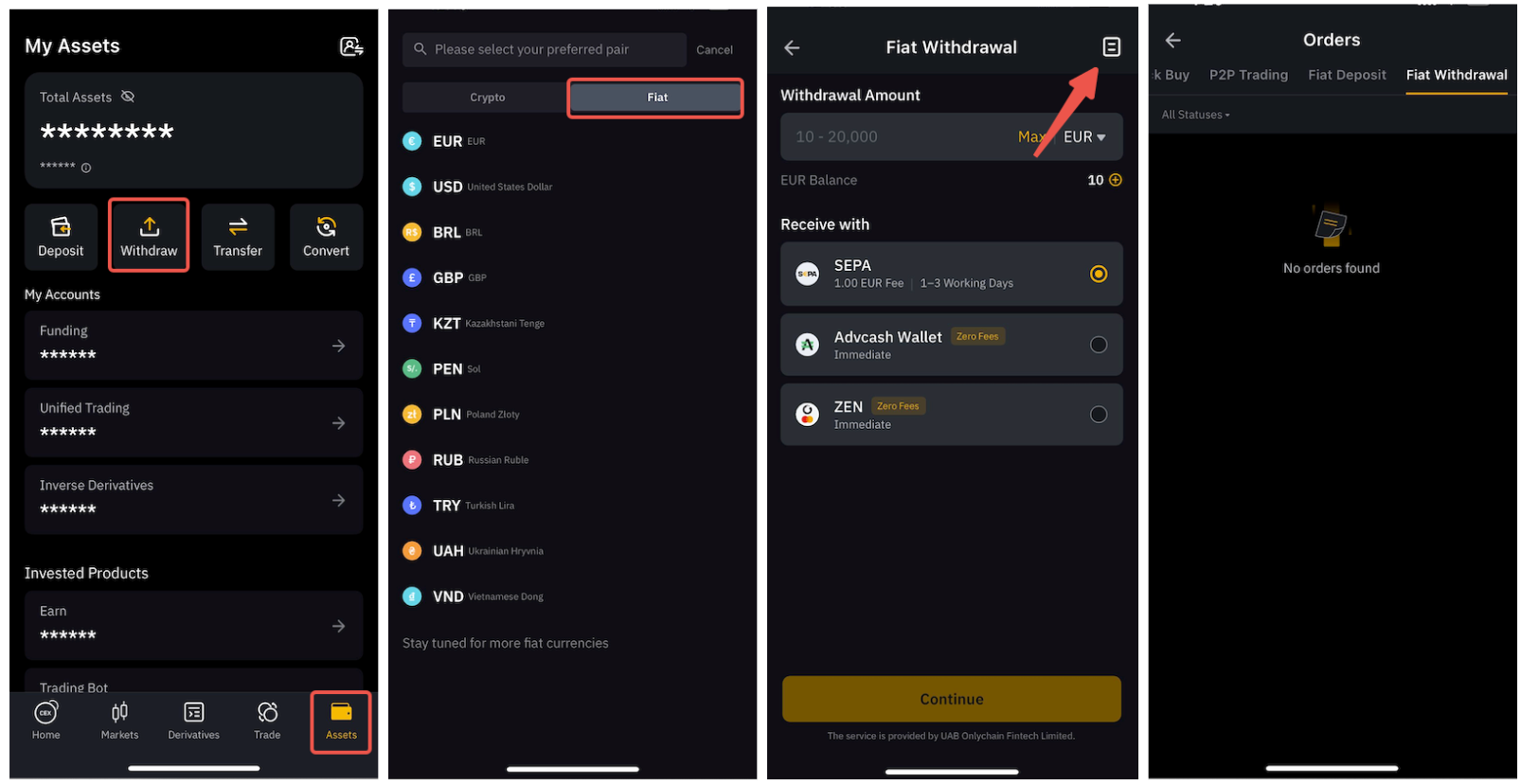Untuk melihat riwayat penarikan fiat Anda, silakan mengeklik Pesanan di sudut kanan atas laman Penarikan Fiat.
