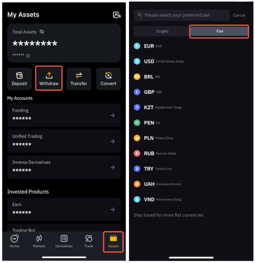 Pada Aplikasi, buka tab Aset dan ketuk Tarik, lalu beralih ke bagian Fiat untuk mengakses daftar opsi yang didukung.