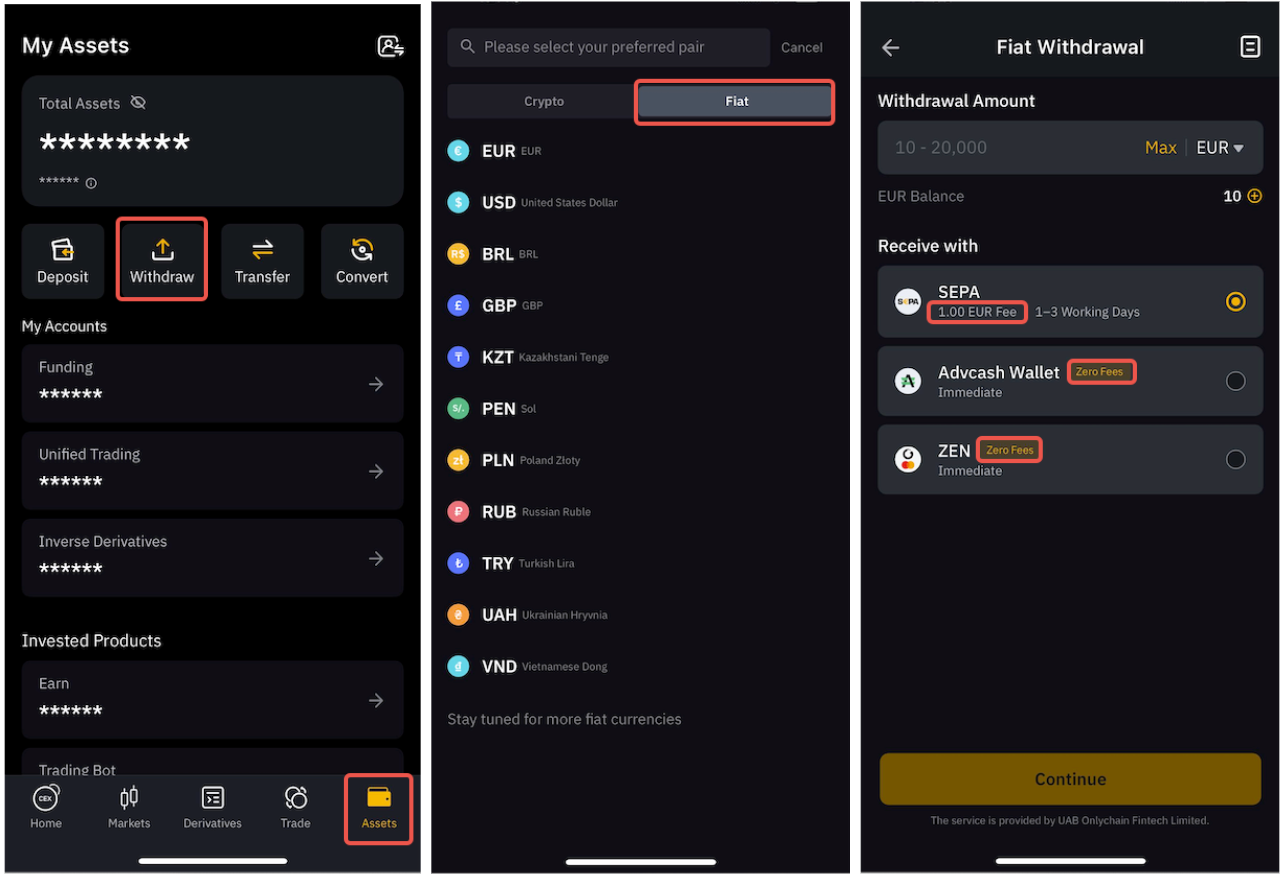 Pada Aplikasi, buka tab Aset dan ketuk Tarik, lalu beralih ke bagian Fiat. Kemudian, ketuk mata uang Fiat dan lihat biaya terkait untuk setiap metode pembayaran.