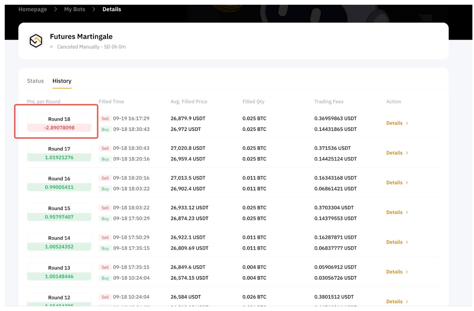 Kunjungi Bot Saya untuk melihat semua putaran perdagangan yang aktif dan telah selesai. Klik Detail untuk melihat detail perdagangan Anda, termasuk laba, total APR, dan laba terealisasi.