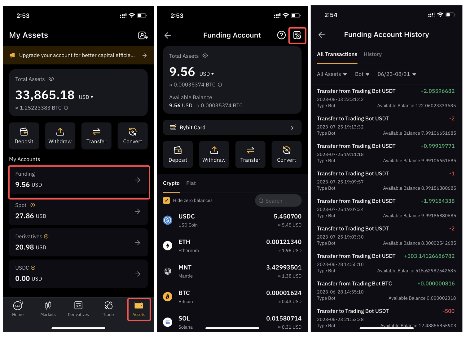 Pada Aplikasi, buka Aset → Akun Pendanaan, ketuk ikon Riwayat yang terletak di sudut kanan atas, dan Anda akan melihat riwayat transfer ke atau dari Bot Perdagangan pada Riwayat Akun Pendanaan Anda.
