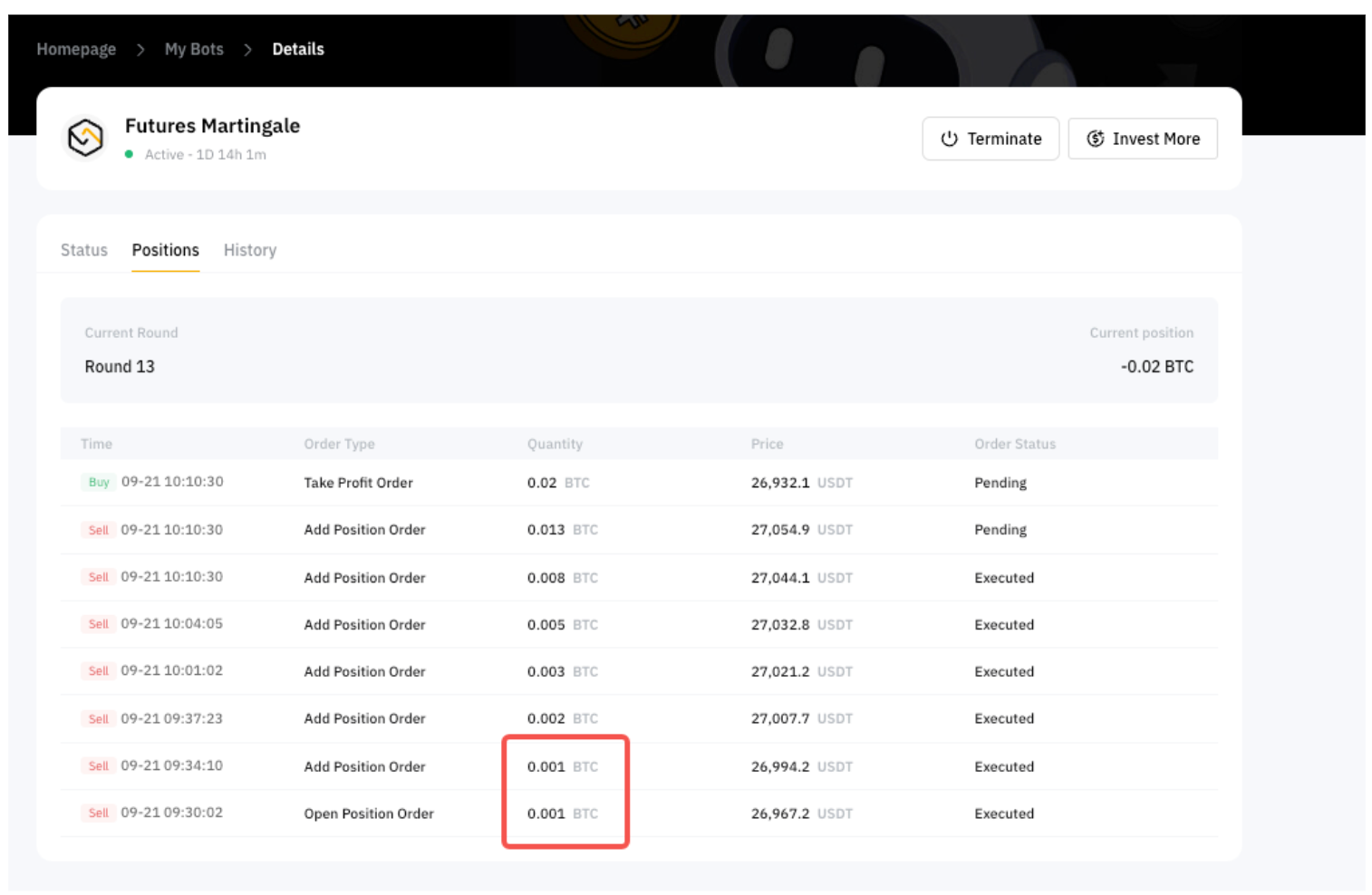 - Saat memperdagangkan kontrak Perpetual USDT menggunakan Bot Martingale Futures, ada persyaratan ukuran pesanan minimum yang harus dipenuhi. Ketika menghitung margin untuk sebuah pesanan, jika margin yang dihitung berada di bawah persyaratan minimum ini, sistem akan secara otomatis membulatkan kuantitas pesanan untuk memenuhinya. Proses pembulatan ini dapat mengakibatkan situasi ketika rasio antara pesanan terakhir dan pesanan saat ini tidak sesuai dengan pengganda posisi yang telah ditetapkan.