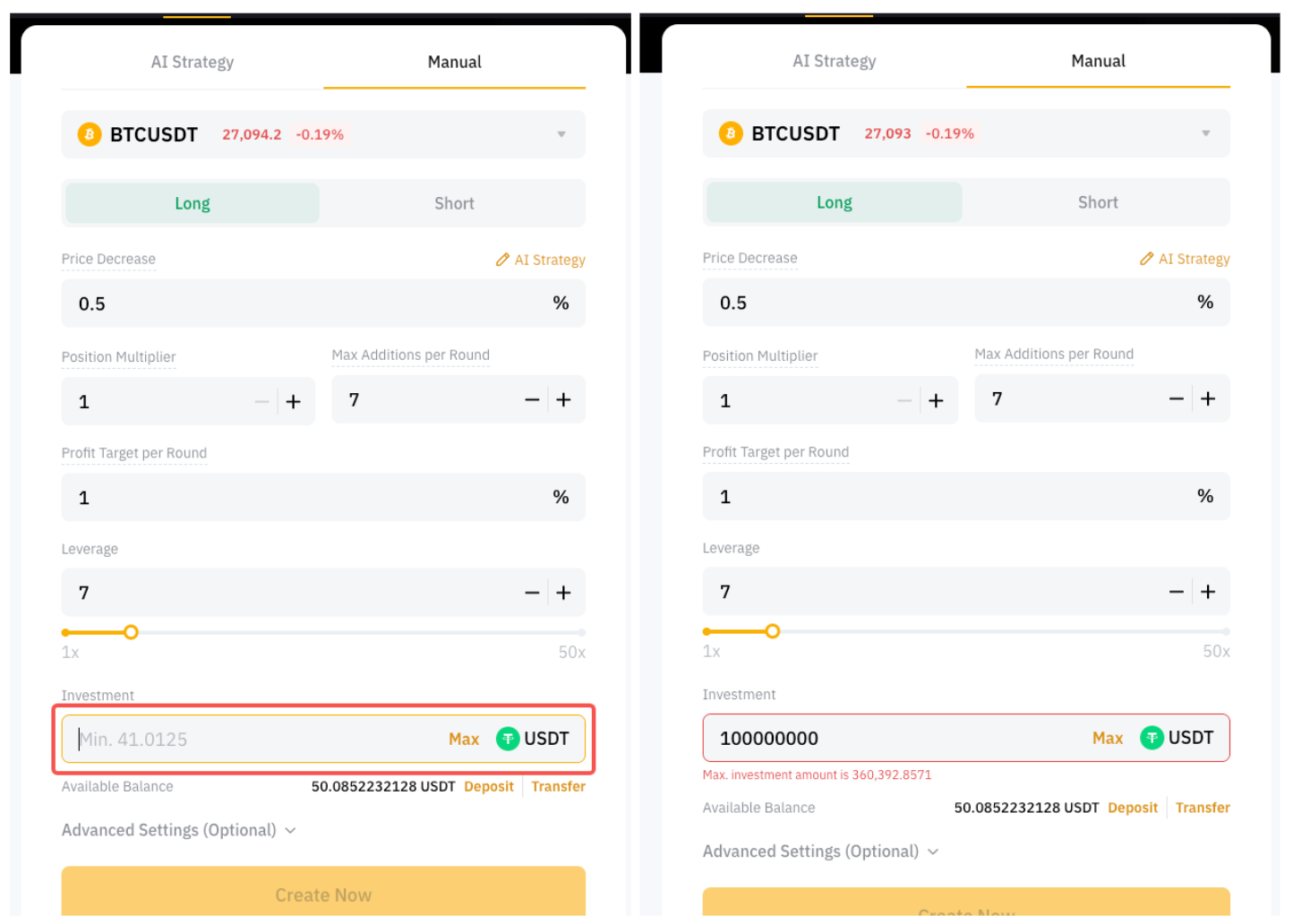 - Anda tidak memiliki aset USDT yang cukup pada Akun Pendanaan untuk memenuhi jumlah investasi minimum strategi Bot Martingale Futures Anda