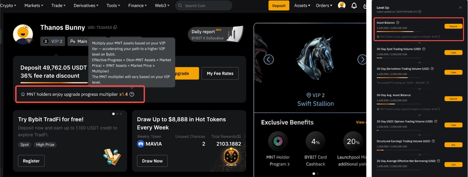 Pengganda 1,5x berlaku untuk kepemilikan MNT Anda, meningkatkan nilai MNT menjadi $97.500 ($65.000 × 1,5). Menambahkan 30.000 USDT membuat total nilai aset Anda menjadi $127.500, yang membuat Anda memenuhi syarat untuk VIP 1.