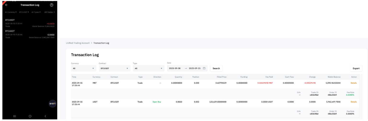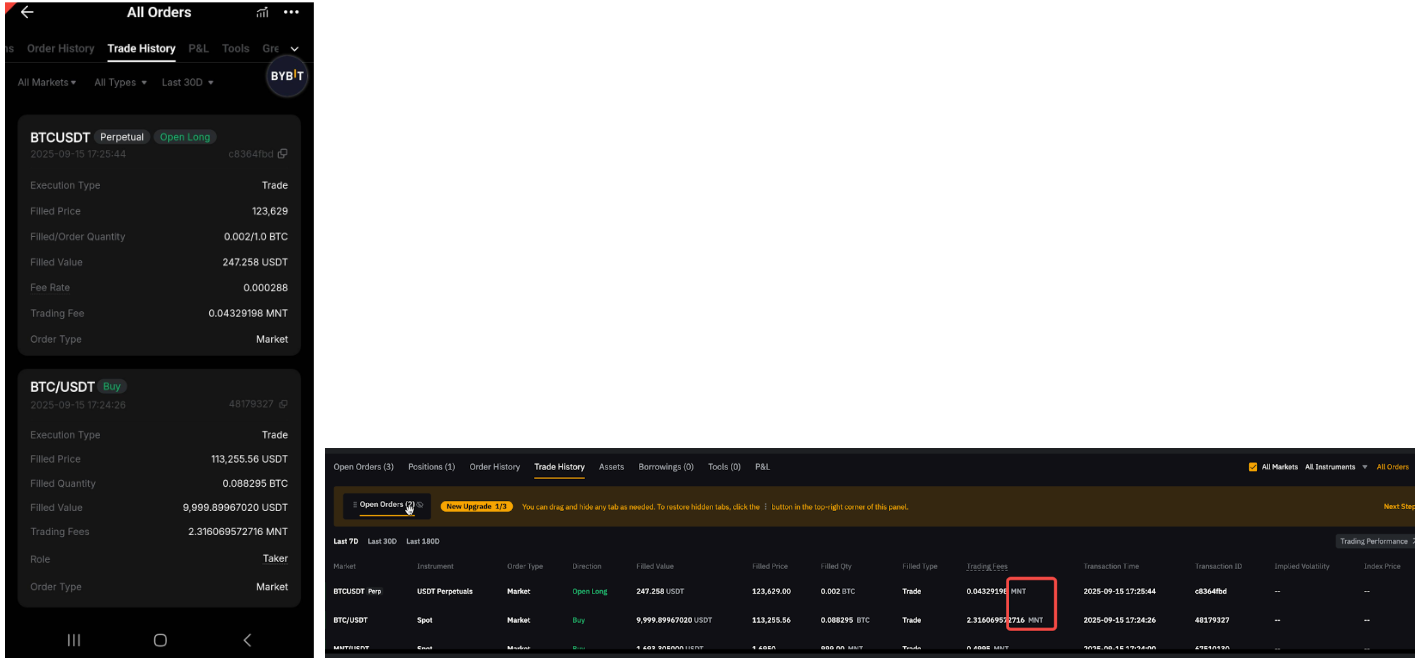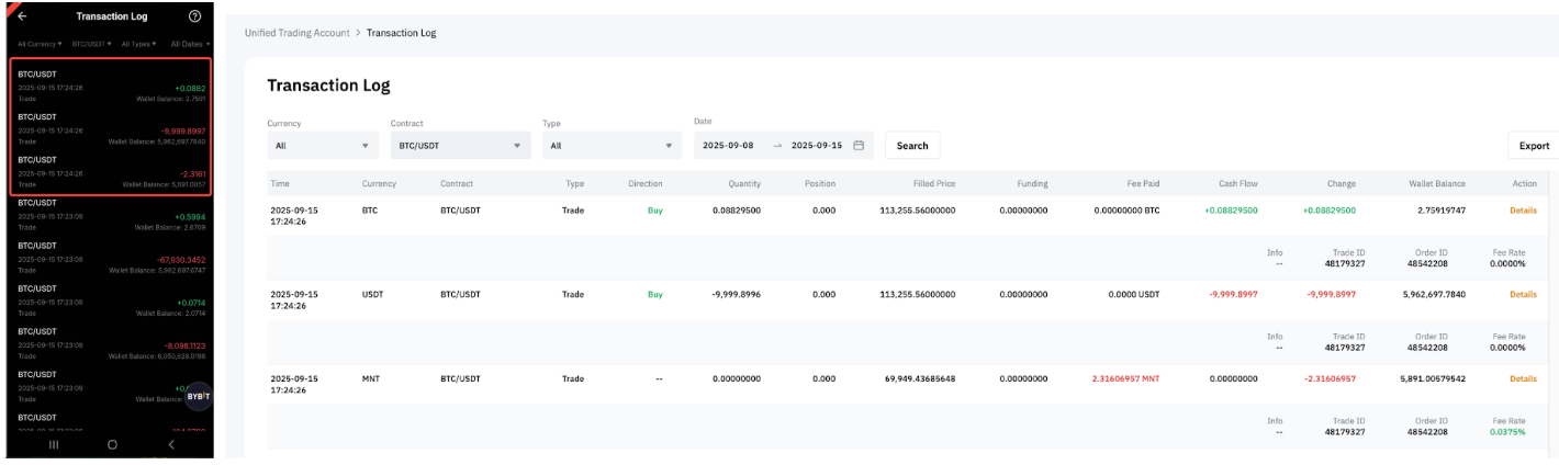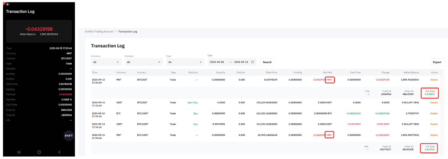 — Untuk L&R tertutup dan terealisasi, setiap bagian biaya yang dibayarkan dalam MNT akan dikonversi kembali dan dicatat sebagai USDT atau USDC, tergantung jenis kontrak.