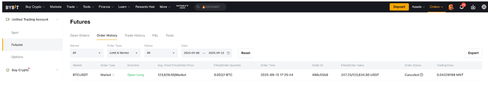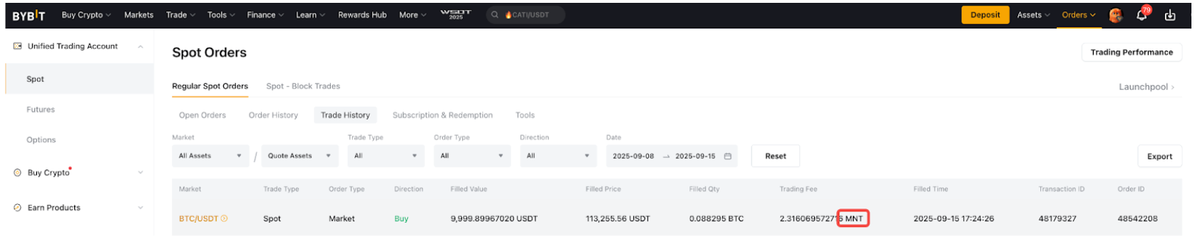 Catatan: Hanya MNT di Akun Trading Terpadu (UTA) Anda yang dapat digunakan untuk membayar biaya trading.