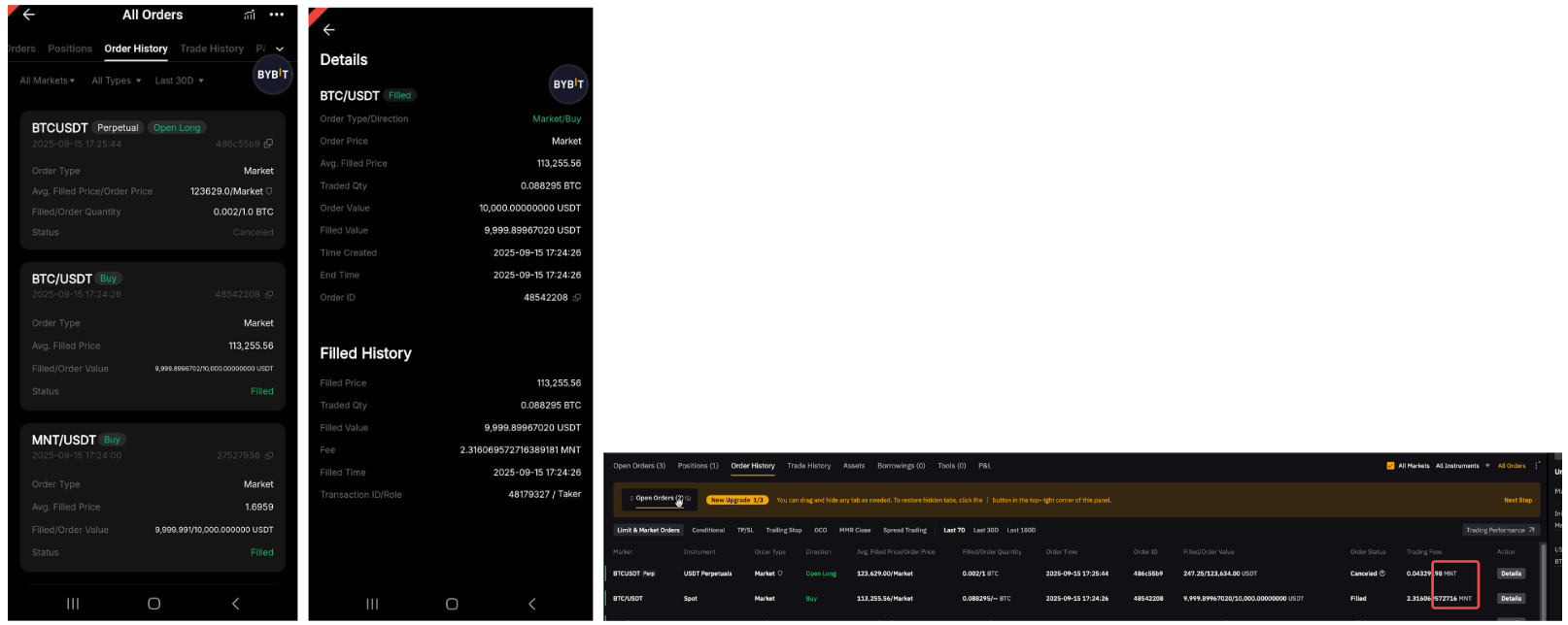 Jika Anda membayar biaya trading dengan MNT, perinciannya dapat ditemukan di Riwayat Trading dan Riwayat Pesanan Anda. Perlu diingat bahwa Riwayat Pesanan dapat menampilkan beberapa entri biaya untuk satu pesanan jika diisi melalui beberapa trading.