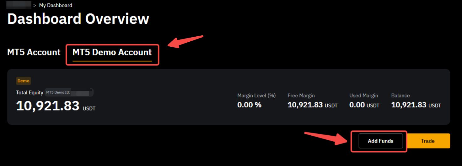 Pengguna dapat mengakses Dasbor Akun Demo mereka seperti yang terlihat pada tangkapan layar di bawah ini dan mengeklik Transfer untuk menambahkan dana demo ke akun demo TradFi (MT5) mereka.