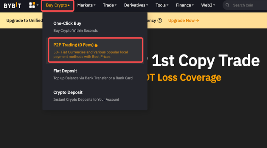 Langkah 1: Klik Beli KriptoPerdagangan P2P di sisi kiri bilah navigasi untuk masuk ke laman Perdagangan P2P.