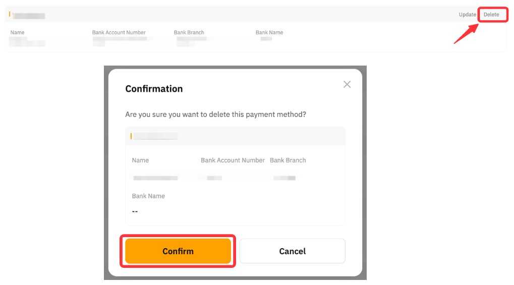 Klik tombol Hapus untuk menghapus metode pembayaran. Pastikan Anda menghapus Metode Pembayaran yang diinginkan dan mengeklik tombol Konfirmasi di jendela pop-up.