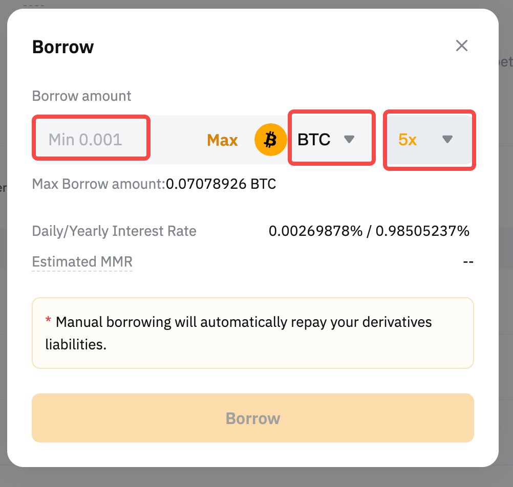 Langkah 2: Pilih aset yang ingin Anda pinjam, atur leverage, dan masukkan jumlahnya. Sistem akan secara otomatis menghitung jumlah pinjaman maksimum berdasarkan nilai jaminan Anda (setelah haircut), leverage, dan batas pinjaman individu. Anda juga dapat melihat perkiraan bunga harian dan tahunan. Setelah semuanya terlihat baik, klik Pinjam untuk mengonfirmasi.