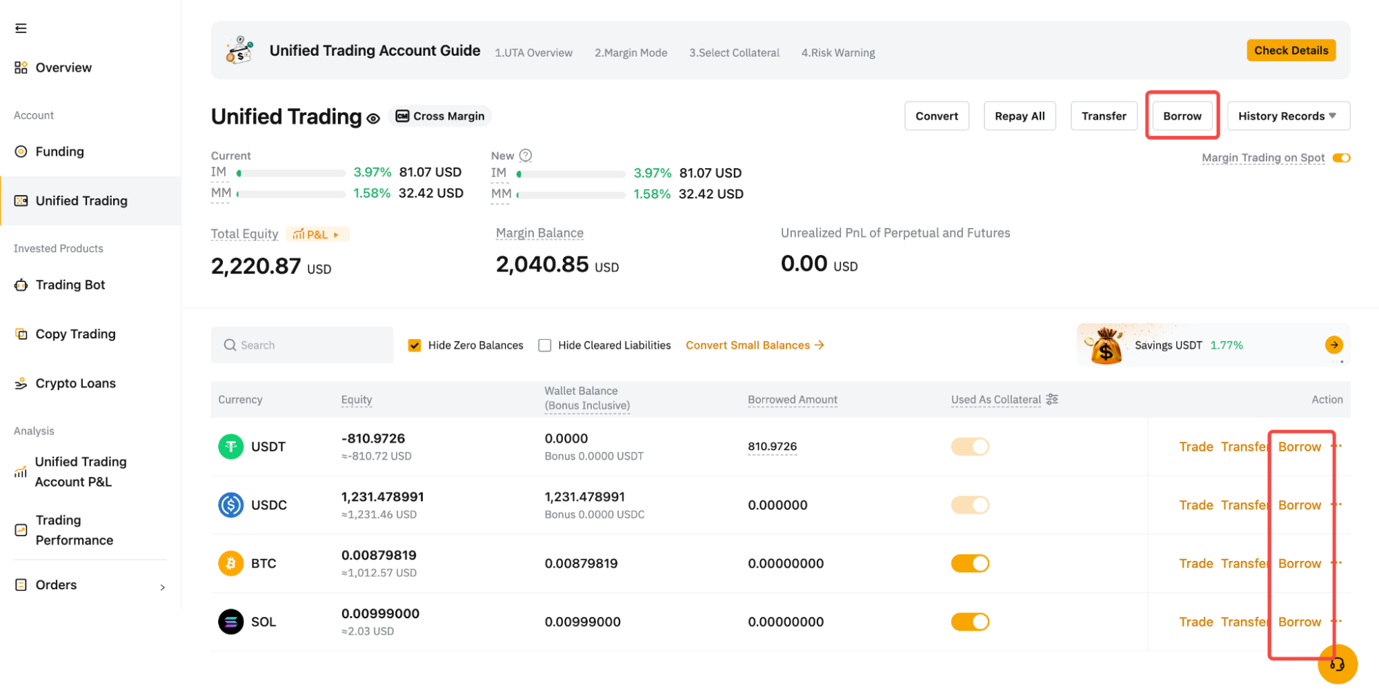 Langkah 1: Temukan halaman aset Akun Perdagangan Terpadu dan klik Pinjam di sudut kanan atas, atau klik tombol Pinjam di samping aset yang ingin Anda pinjam.