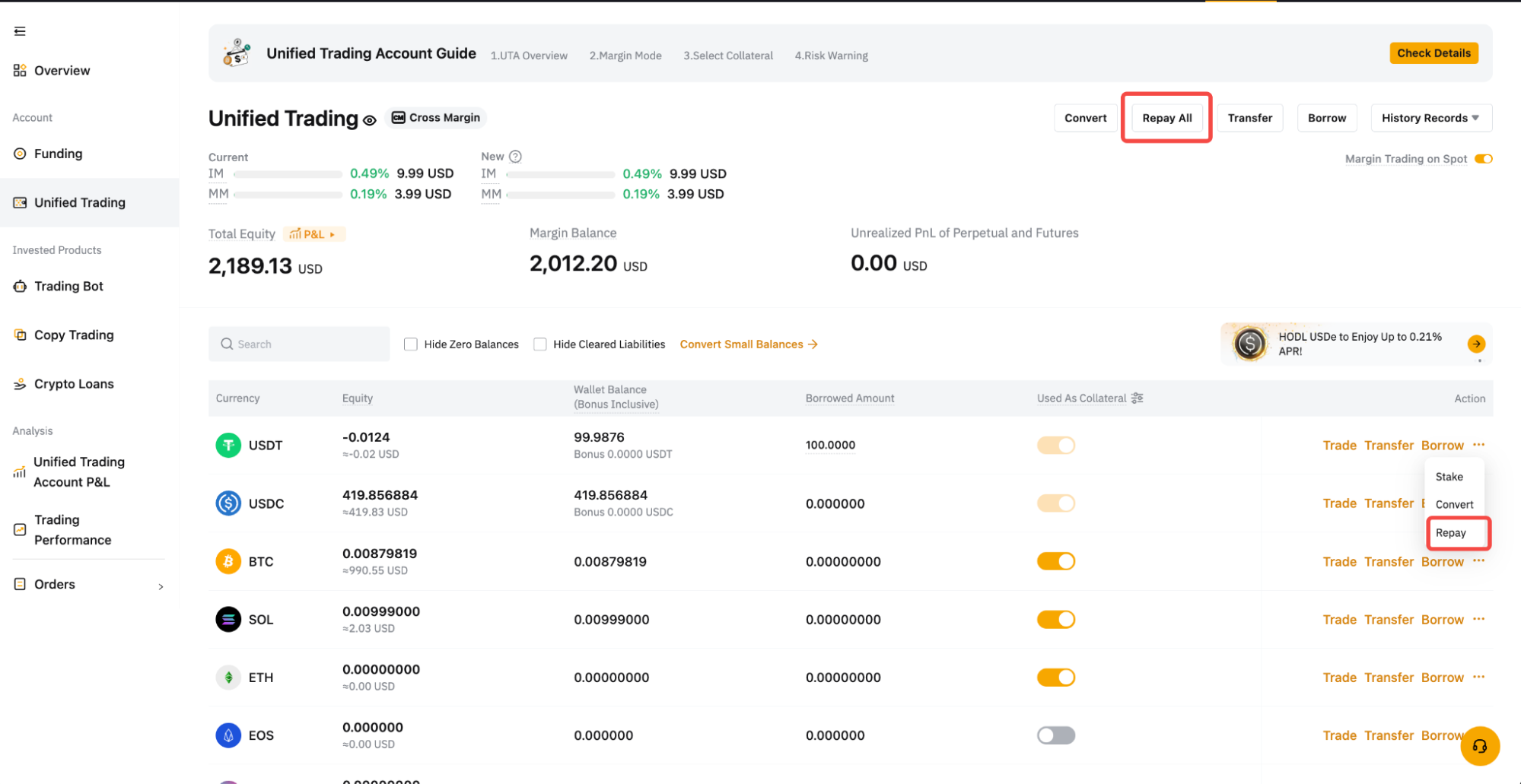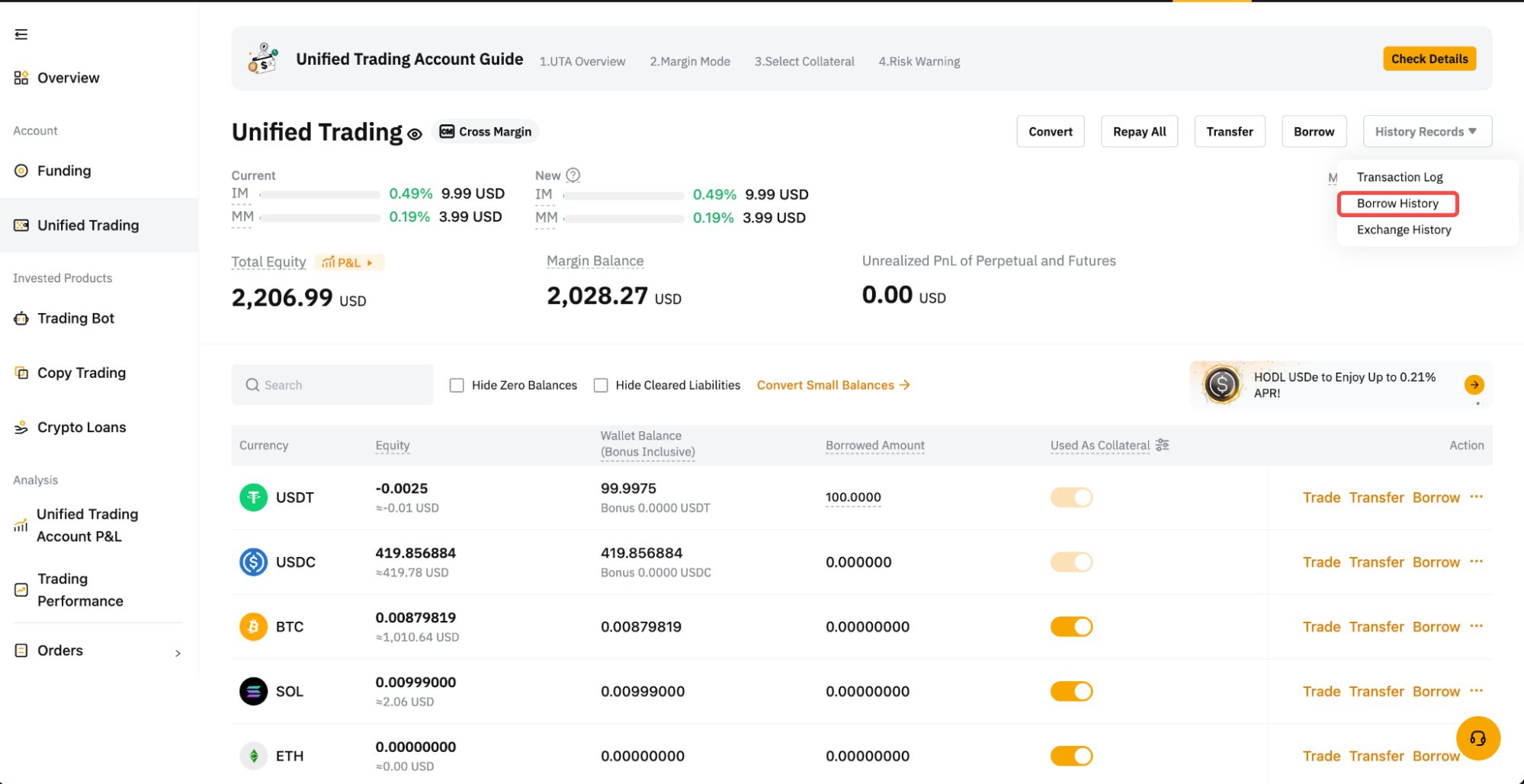 Langkah 3: Setelah meminjam, Anda dapat melihat jumlah pinjaman untuk setiap koin di Akun Perdagangan Terpadu Anda. Untuk melihat ikhtisar semua pinjaman Anda, kunjungi  Riwayat Pinjam.