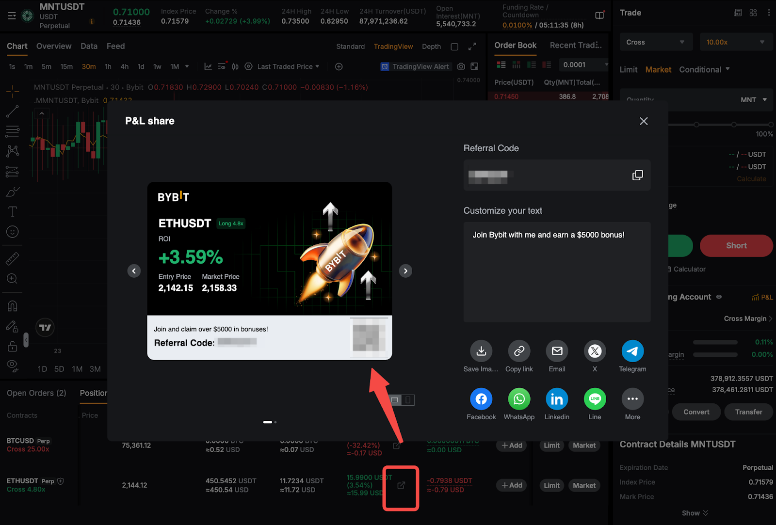 Anda juga dapat membagikan L&R posisi terbuka Anda saat ini dengan membuka tabel posisi di bawah grafik dan mengeklik ikon "bagikan" di samping angka L&R belum terealisasi Anda saat ini.