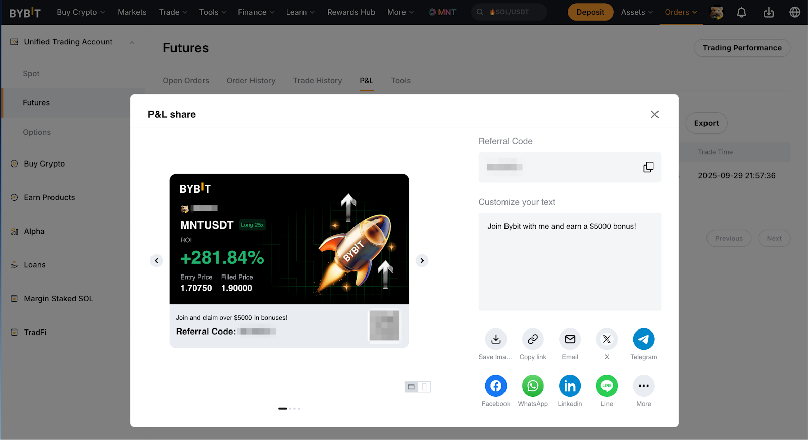 Langkah 3: Pilih perdagangan Futures yang relevan dari panel samping, dan beralih ke tab L&R untuk menemukan L&R tertutup yang ingin Anda bagikan.