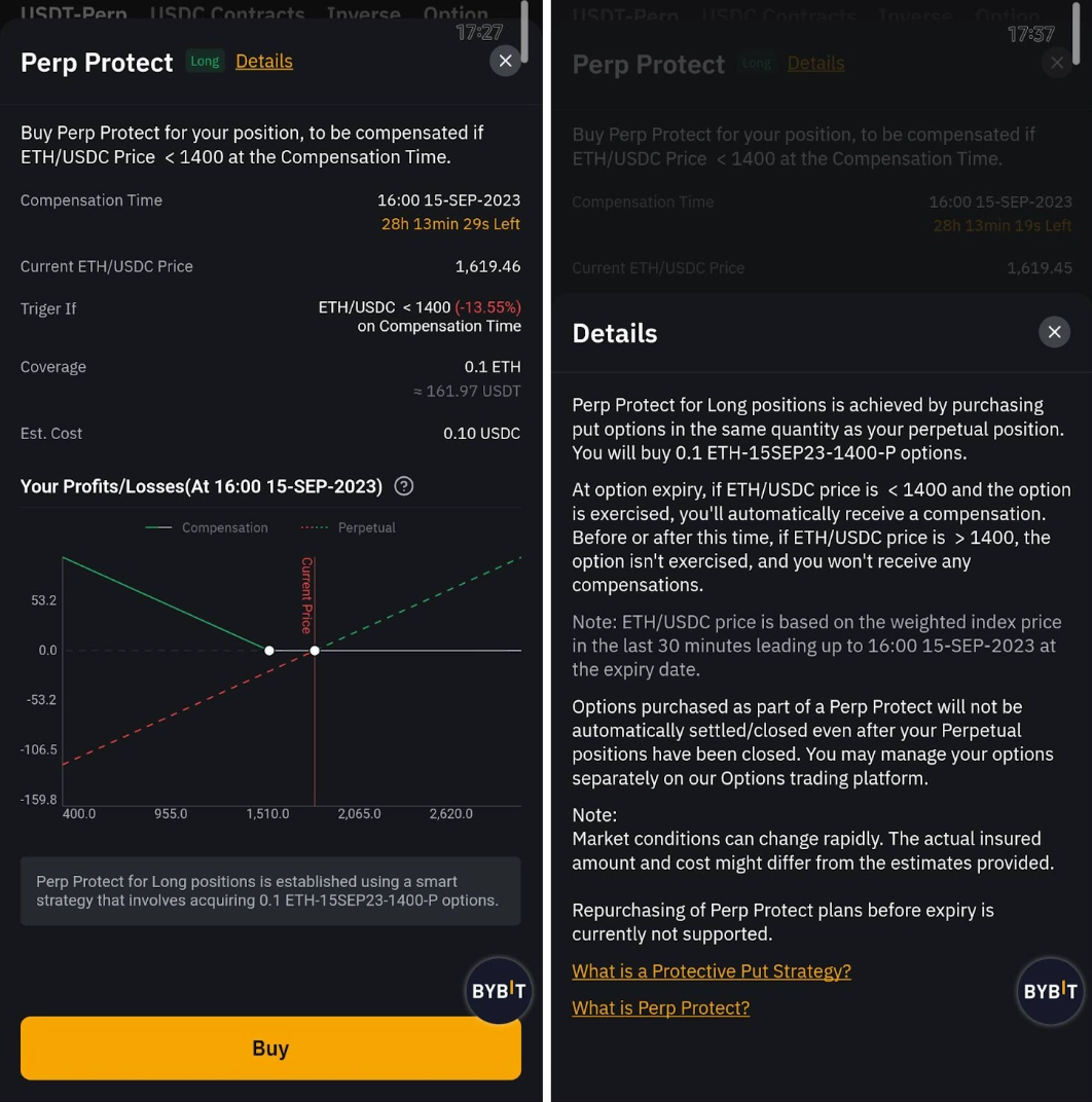 - Biaya: Premi yang diperlukan untuk membeli Perp Protect. Harap dicatat bahwa kondisi pasar dapat berubah dengan cepat. Biaya aktual mungkin sedikit berbeda dari estimasi yang diberikan.