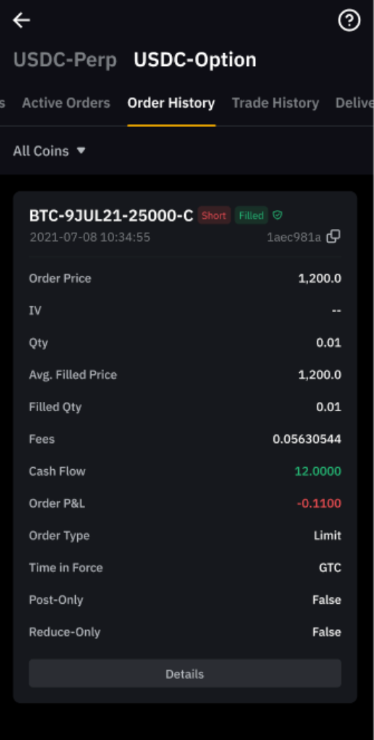 Jika posisi Perpetual Anda ditutup sebelum waktu kompensasi, Anda tidak akan dapat melihat pesanan Opsi yang diperoleh dari Perlindungan Perp dari tab posisi Perpetual Anda. Anda dapat membuka halaman Pesanan Opsi untuk melihat posisi Opsi.