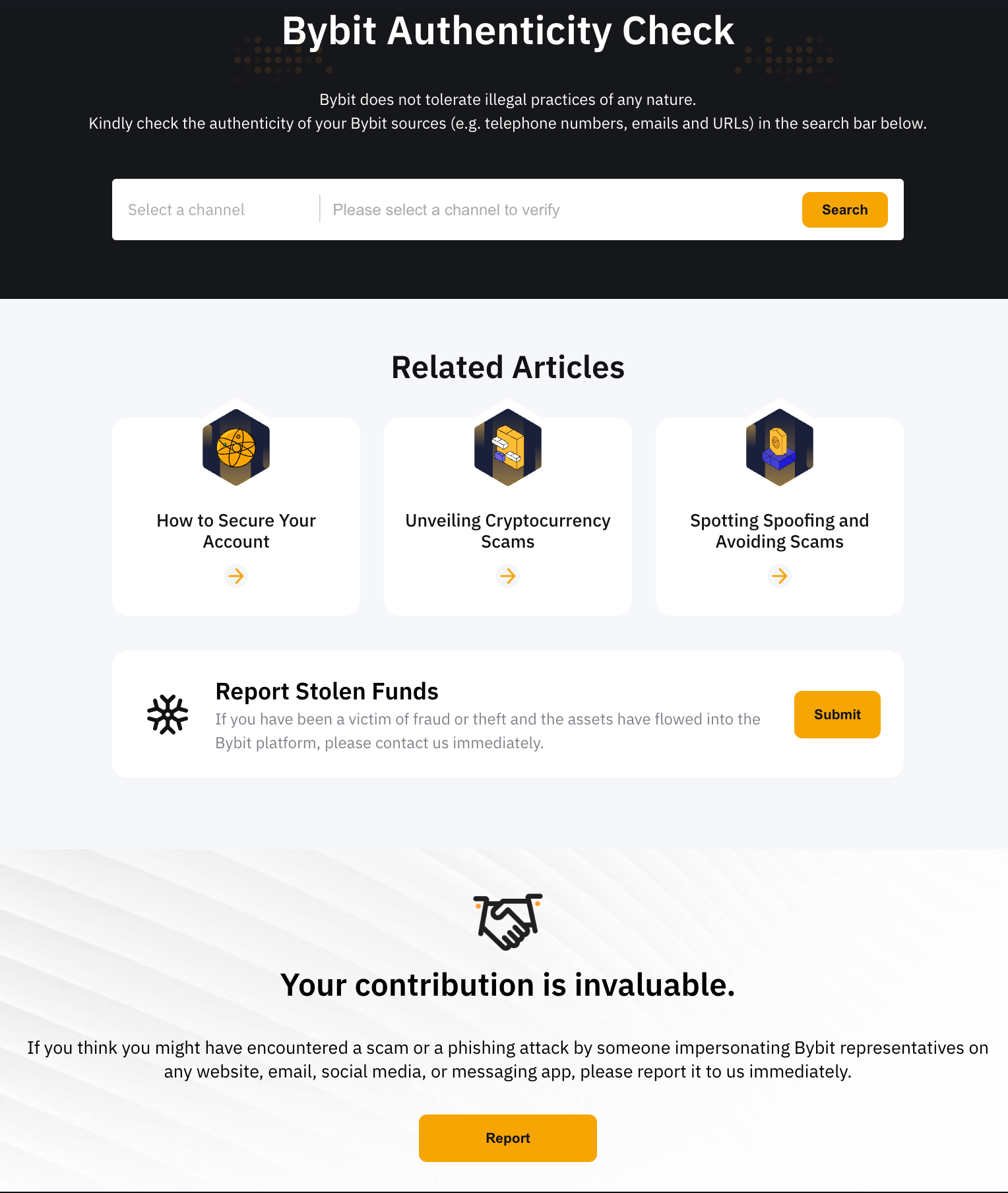 Jika Anda merasa mungkin telah mengalami penipuan atau serangan phishing oleh seseorang yang menyamar sebagai perwakilan Bybit di situs web, email, media sosial, atau aplikasi perpesanan apa pun, harap beri tahu kami dengan salah satu cara berikut: