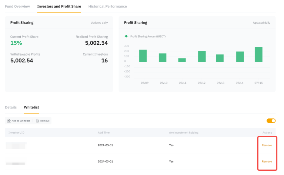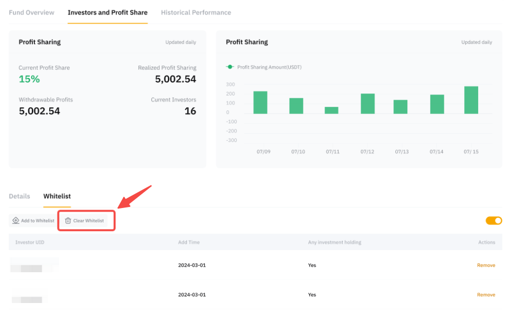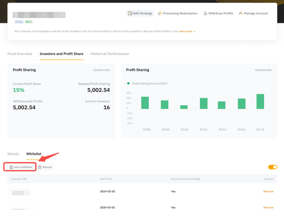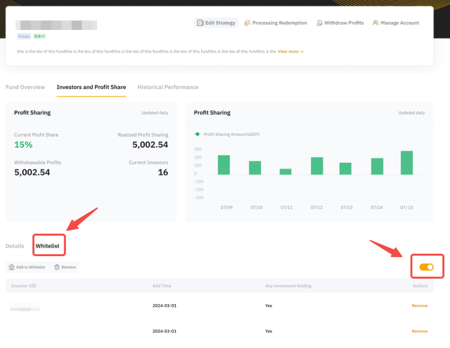 Pengguna yang dapat berinvestasi dalam strategi Anda hanyalah mereka yang masuk dalam whitelist. Pengguna yang tidak masuk dalam whitelist tidak lagi bisa menjadi Investor Anda.