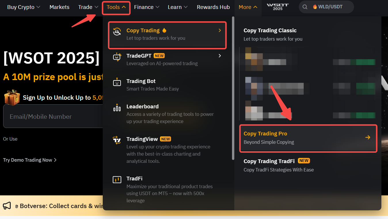 Langkah 1: Masuk ke situs web Bybit, lalu klik Alat → Copy Trading → Copy Trading Pro di bilah navigasi.