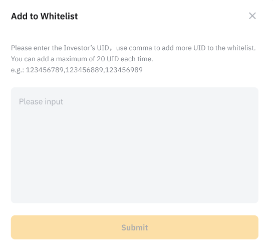 — Anda dapat mengimpor hingga 20 UID sekaligus. Tidak ada batasan total jumlah Investor yang masuk dalam whitelist.
