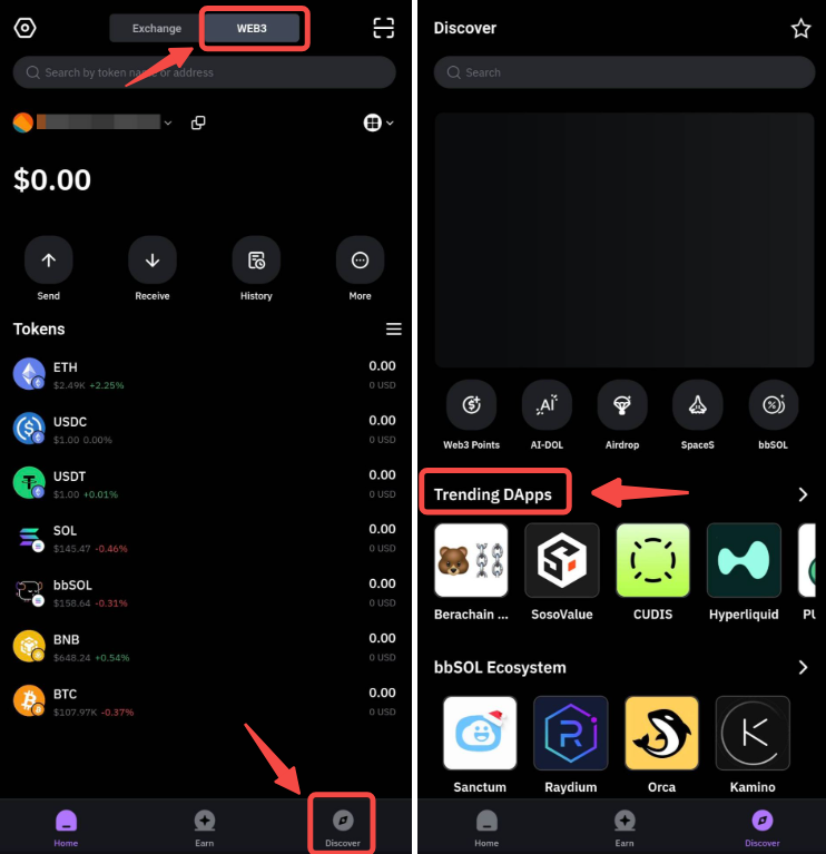 a) Buka Aplikasi Bybit, masuk halaman Wallet dan ketuk Temukan → Trending dApp.