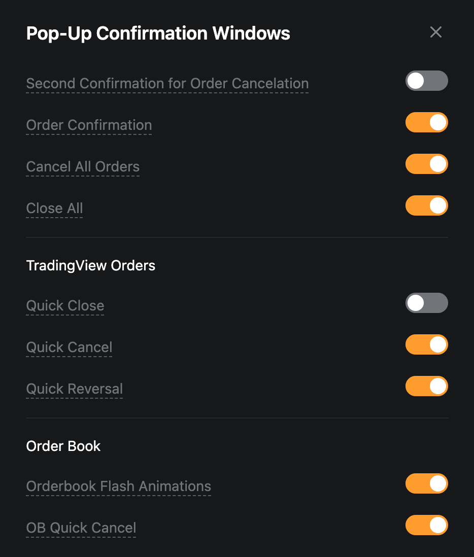 Bybit sangat menyarankan agar setidaknya jendela konfirmasi berupa Konfirmasi Pesanan, Pembalikan Cepat, Penutupan Semua, dan Pembatalan Semua diaktifkan untuk menghindari tindakan yang salah. |
