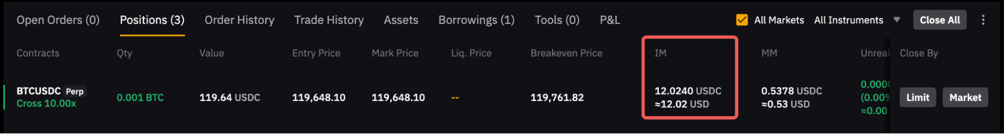 Harap diperhatikan bahwa margin awal yang ditampilkan pada tab posisi mencakup biaya taker, yang mungkin timbul saat menutup posisi.