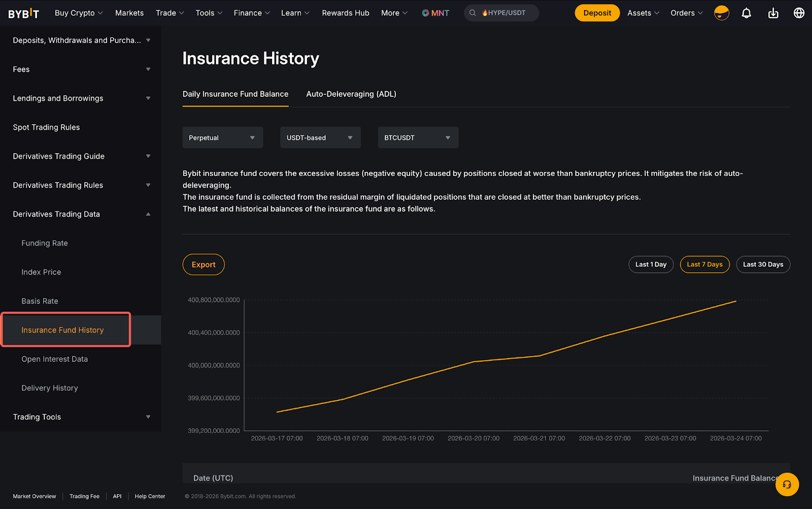 Untuk melihat saldo dana asuransi Bybit untuk semua kontrak Perpetual dan Berjangka, navigasi ke Ikhtisar Pasar Bybit dan pilih Riwayat Dana Asuransi.