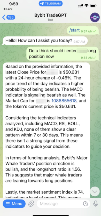 Akses Mudah dan Analisis Ahli: Terhubung langsung dengan TradeGPT di Telegram untuk akses mudah data waktu nyata dari Bybit, dikombinasikan dengan analisis data mutakhir untuk analisis mendalam.
