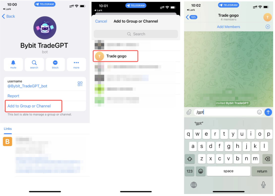 - Klik Tambahkan pada Grup atau Saluran di halaman Info Bybit TradeGPT.