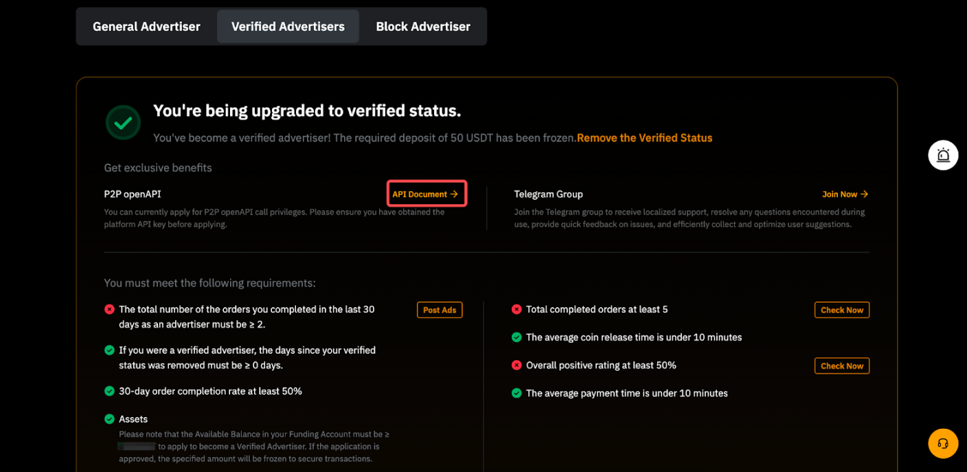 Dengan memperluas akses API, Anda akan dapat mengelola Iklan dan Pesanan P2P Anda, tergantung pada pengaturan Kinerja Utama API Anda.