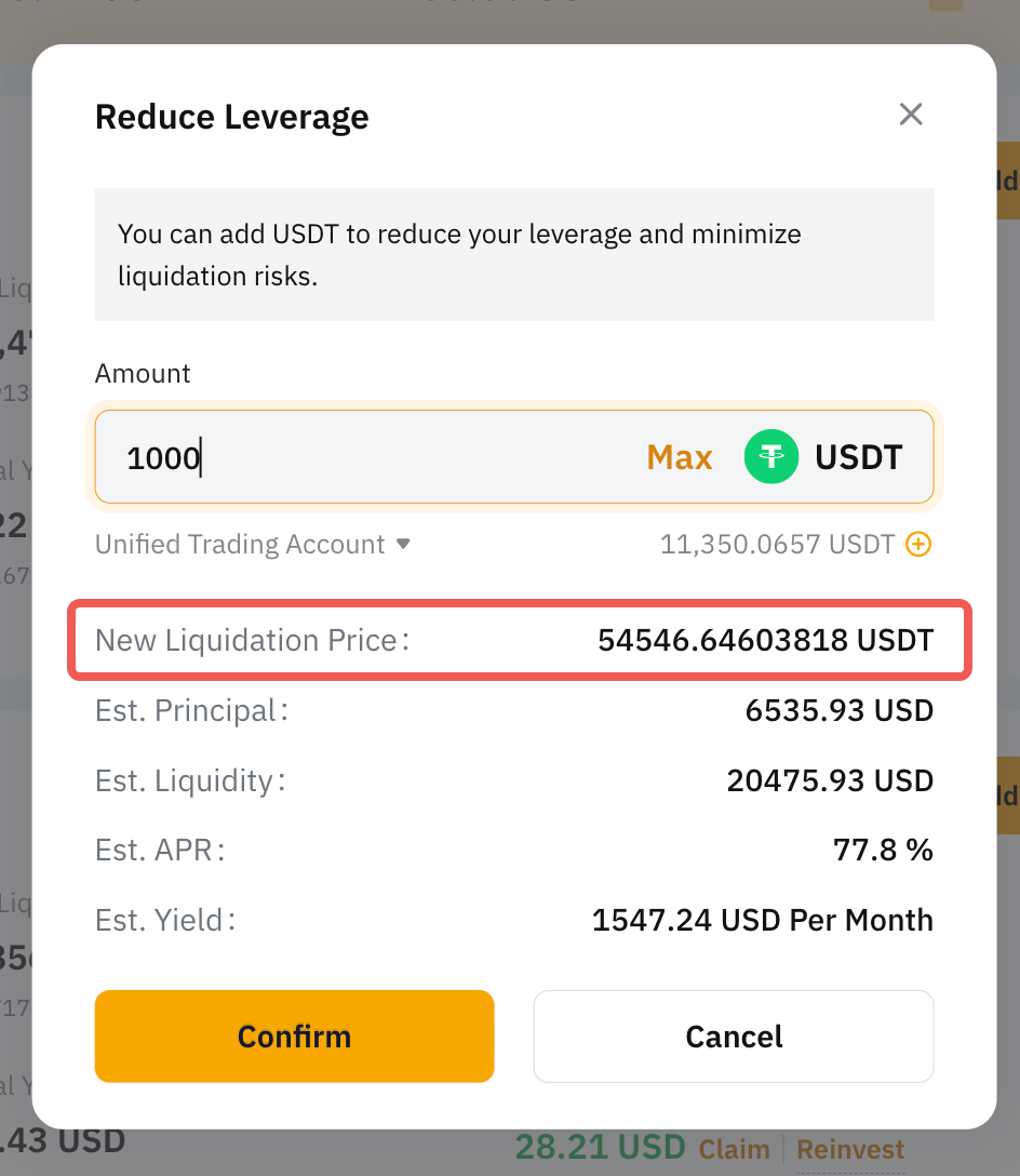 Harap diperhatikan bahwa semua prinsipal investasi dapat hangus jika posisi dilikuidasi. Anda dapat menambahkan lebih banyak USDT untuk mengurangi leverage dan meminimalkan risiko likuidasi.